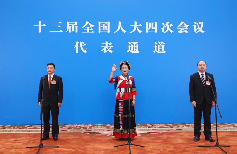 2021年3月8日,第十三屆全國(guó)人民代表大會(huì)第四次會(huì)議舉行第二場(chǎng)“代表通道”采訪活動(dòng)。這是全國(guó)人大代表?xiàng)钫鹕ㄗ螅?、范永貞(中)、齊嵩宇通過網(wǎng)絡(luò)視頻方式接受采訪。新華社記者 張玉薇 攝