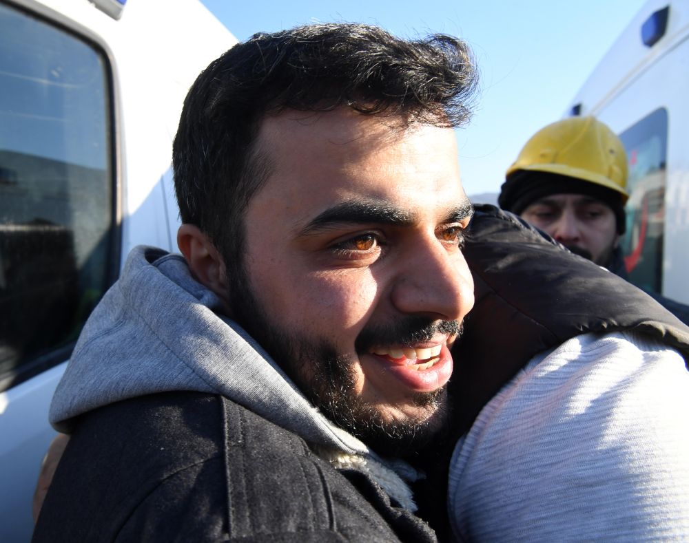 2月9日,中土救援隊聯(lián)手在安塔基亞市救出兩名幸存者后,獲救幸存者的親人擁抱致意。
