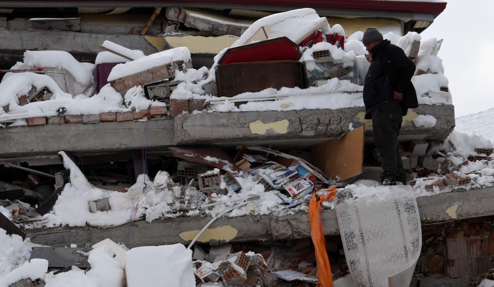 2月7日,在埃爾比斯坦地區(qū),一名男子查看地震中受損的建筑物。