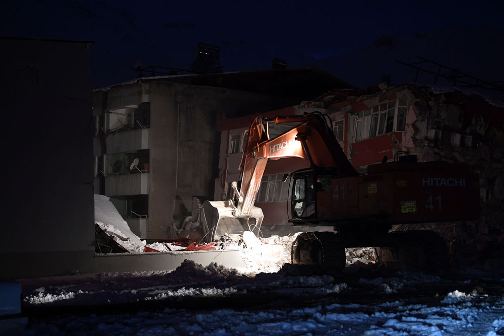 2月7日晚,在埃爾比斯坦地區(qū),救援人員在一處地震廢墟搜救。