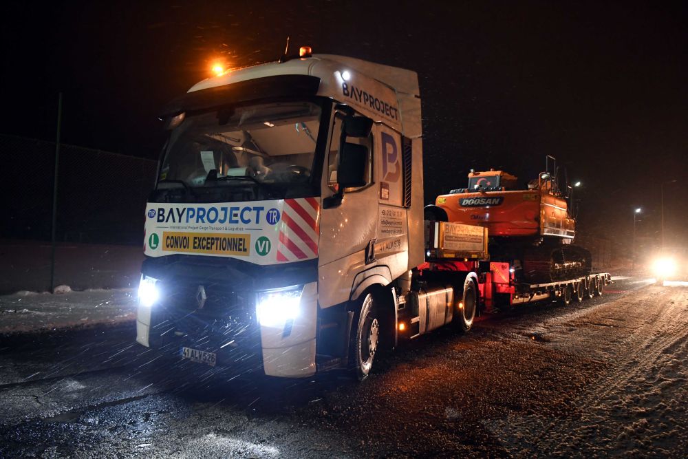 2月6日晚在伊斯坦布爾至安卡拉公路上拍攝的運往災(zāi)區(qū)的大型機械。