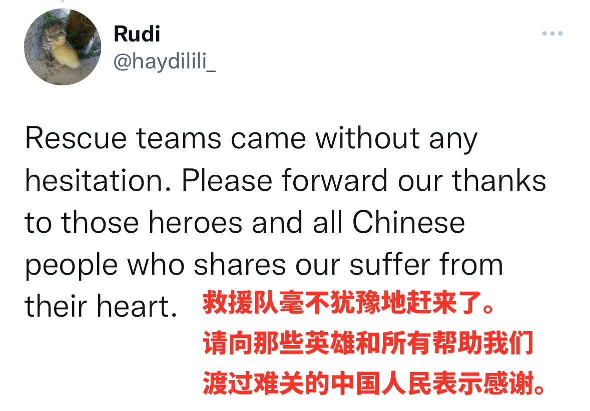 還有土耳其網(wǎng)友用中文和漢語拼音表達(dá)對中國救援隊的感謝。