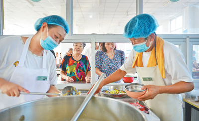 8月6日,河北省獻縣段村鎮(zhèn)段村中學安置點,群眾在排隊取餐。 本報記者 陳 斌攝