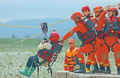 8月5日,吉林省舒蘭市七里鄉(xiāng)三合村,吉林市森林消防支隊隊員在利用繩索救援受困群眾。 孟海鷹 薛二濤攝影報道