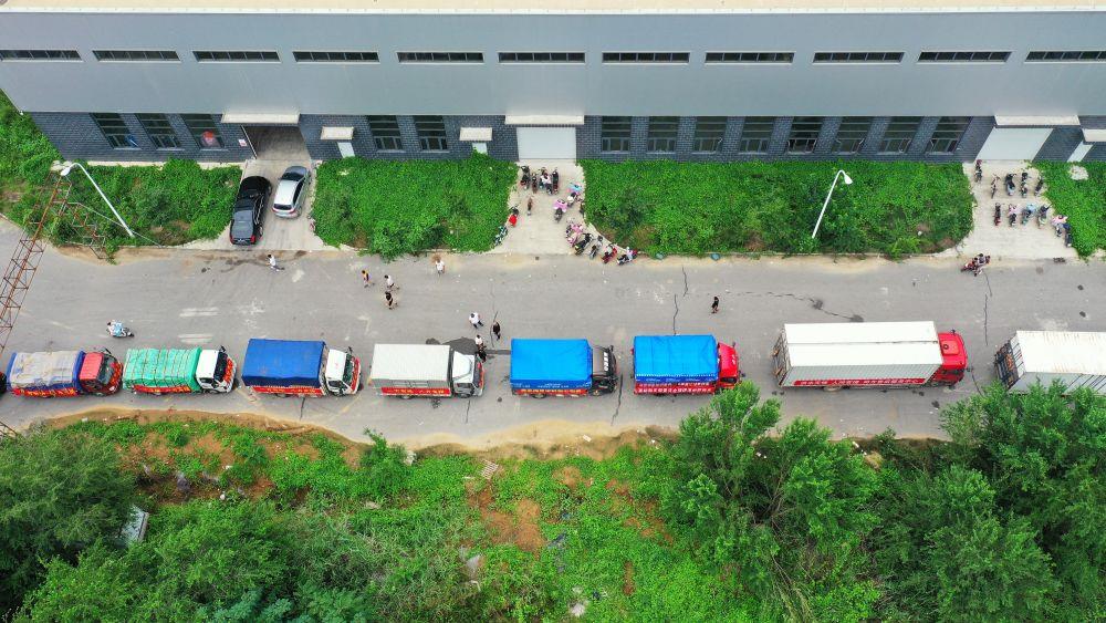 △河北涿州鋼研物資儲備點外,運送物資的車輛排起長隊。