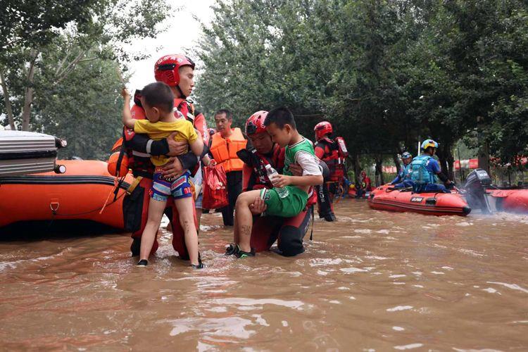 △8月3日,河北涿州北二環(huán)附近,山東消防救援人員抱著孩子通過積水路段。