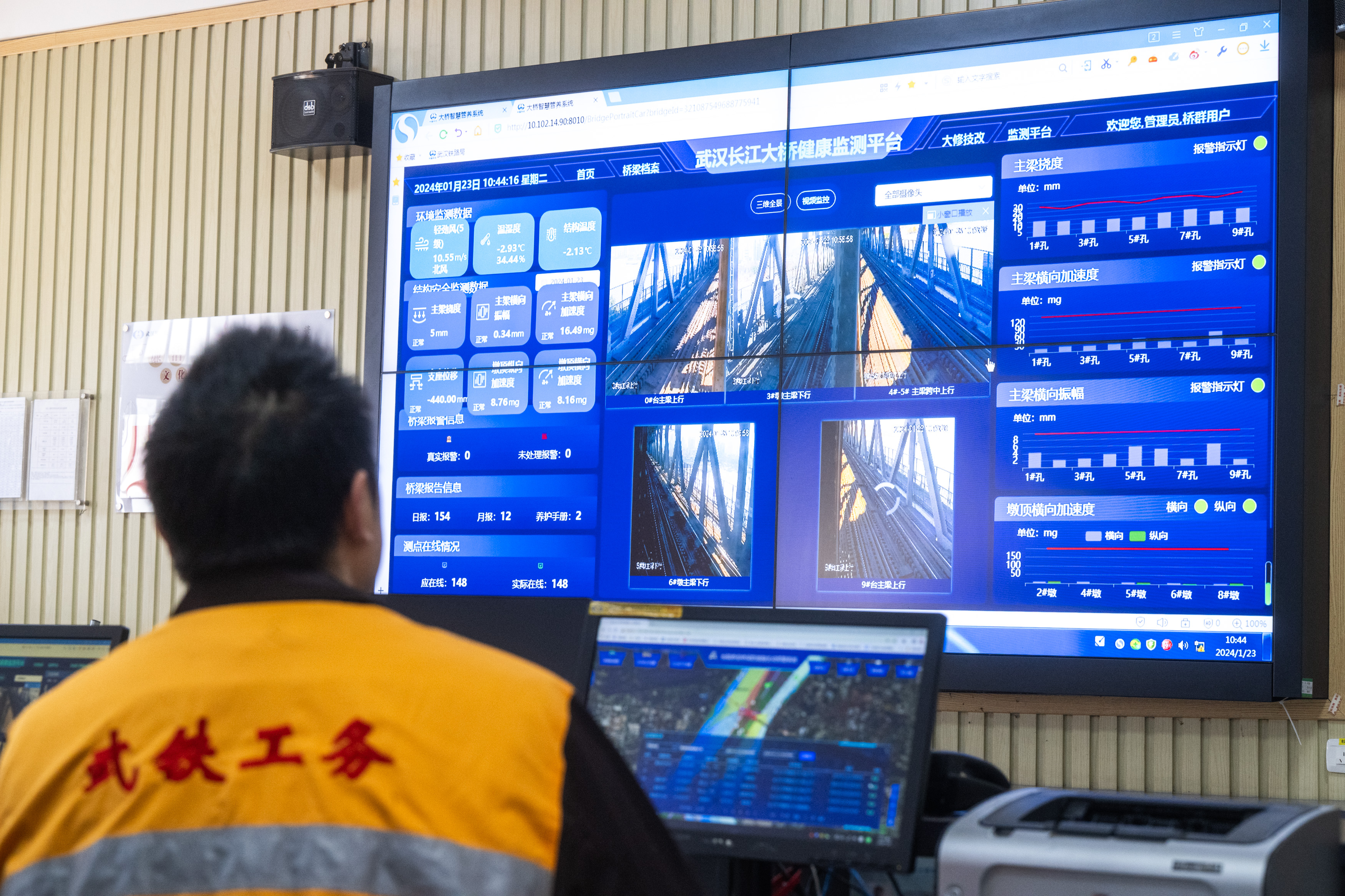 1月23日,武漢長江大橋橋梁車間員工在主控室對武漢長江大橋進(jìn)行監(jiān)測。新華社記者肖藝九 攝 武漢長江大橋橋梁車間副主任劉浩然說,這些數(shù)據(jù)能夠提供更加準(zhǔn)確、科學(xué)的數(shù)據(jù)參考和養(yǎng)護(hù)指導(dǎo),使得大橋運(yùn)維養(yǎng)護(hù)更為精細(xì)、快速、智能。 在一代又一代“養(yǎng)橋人”的守護(hù)下, 60多年來,大橋先后經(jīng)歷8次較大洪水、77次輪船碰撞,依然堅(jiān)固。最新檢驗(yàn)報(bào)告顯示,武漢長江大橋全橋無變位下沉,9孔鋼梁、8個(gè)橋墩無一裂紋變形,百萬鉚釘無松動(dòng)脫落,全橋無重大病害。
