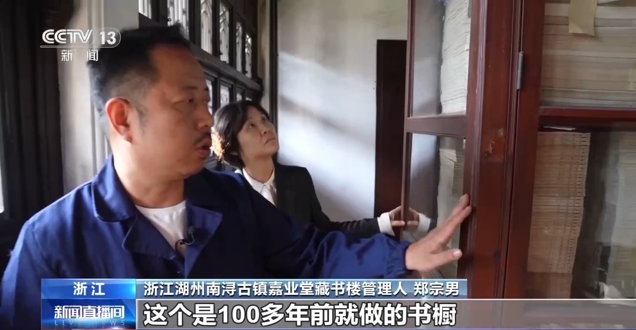 浙江湖州南潯古鎮(zhèn)嘉業(yè)堂藏書樓管理人鄭宗男:嘉業(yè)藏書樓最重要的一項(xiàng)工作就是古籍保護(hù),這個(gè)是100多年前就做的書櫥,用的材質(zhì)是防蟲效果非常好的柚木。窗戶有兩扇,外面是白鐵皮,避免陽光對(duì)書籍的直射。江南地區(qū)比較潮濕,怎么防范對(duì)書籍造成的破壞?像太陽剛剛升起的時(shí)候,上午就打開西廂房的窗戶,等到午后再把東廂房的窗戶打開,這樣既可以讓書本得到一個(gè)順暢的呼吸,又避免遭到陽光的直射。