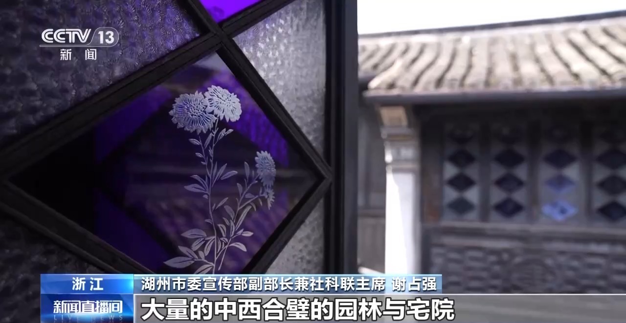像這樣中西合璧的百年建筑,是南潯古鎮(zhèn)建筑的獨(dú)有特色。這些建筑既引入西方建筑的元素,又傳承了中國古典人文精神。這棟傳統(tǒng)中式房屋的窗戶玻璃,鑲嵌的是法國進(jìn)口的藍(lán)晶玻璃,上面定制的圖案卻是中國的花卉、瓜果等。