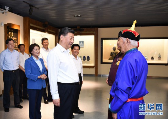2019年7月15日,習近平總書記在赤峰博物館同古典民族史詩《格薩(斯)爾》非物質文化遺產(chǎn)傳承人親切交談。