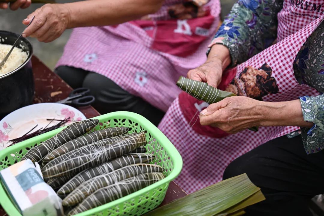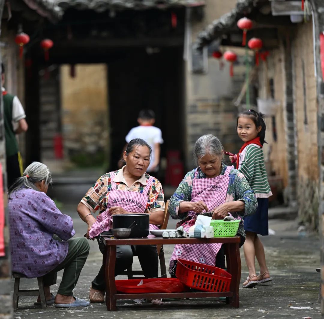 時(shí)光在古村內(nèi)的石板路上流淌。 沿著回廊巷道進(jìn)入古建筑群院落內(nèi),只見幾位閑聊正歡的大姐和阿婆正在包粽子,這是當(dāng)?shù)囟宋绻?jié)特有的儀式感。她們包的粽子當(dāng)?shù)厝私袥鲷?,又稱灰水粽。見到客人來訪,她們熱情招呼著一起吃粽子,軟糯的粽子蘸上蜂蜜或白糖,和生活一樣甜。 端午時(shí)節(jié),粽香陣陣,只見她們手法嫻熟,談笑間,粽葉在她們手中翻飛、收攏,捆扎勻稱。粽葉的清香和古建筑的古色古香,以及散學(xué)歸來的孩童的歡聲陣陣,為端午這個(gè)傳統(tǒng)節(jié)日增添了幾分溫馨與熱鬧。