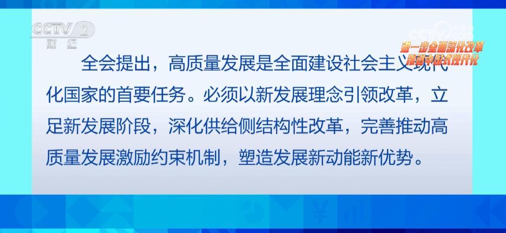 全會提出,高質(zhì)量發(fā)展是全面建設(shè)社會主義現(xiàn)代化國家的首要任務(wù)。必須以新發(fā)展理念引領(lǐng)改革,立足新發(fā)展階段,深化供給側(cè)結(jié)構(gòu)性改革,完善推動高質(zhì)量發(fā)展激勵約束機(jī)制,塑造發(fā)展新動能新優(yōu)勢。要健全因地制宜發(fā)展新質(zhì)生產(chǎn)力體制機(jī)制,健全促進(jìn)實體經(jīng)濟(jì)和數(shù)字經(jīng)濟(jì)深度融合制度,完善發(fā)展服務(wù)業(yè)體制機(jī)制,健全現(xiàn)代化基礎(chǔ)設(shè)施建設(shè)體制機(jī)制,健全提升產(chǎn)業(yè)鏈供應(yīng)鏈韌性和安全水平制度。