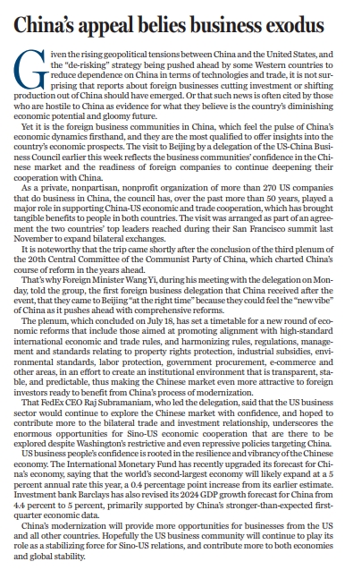 一段時(shí)間以來,中美之間的地緣政治緊張態(tài)勢有所加劇,一些西方國家打著“去風(fēng)險(xiǎn)”政策的旗號,在科技與貿(mào)易領(lǐng)域推行所謂“減少對中國依賴”的做法,“外企停止在華投資生產(chǎn)”的相關(guān)報(bào)道也由此產(chǎn)生,這些報(bào)道更是經(jīng)常被一些敵視中國的勢力所引用,作為他們眼里“中國經(jīng)濟(jì)潛力不再、前景堪憂”的證據(jù)。 但在華的外企們想必都能切身感受到當(dāng)下中國經(jīng)濟(jì)跳動(dòng)的脈搏,也更有資格對中國經(jīng)濟(jì)前景分享見解。本周早些時(shí)候,美中貿(mào)易全國委員會(huì)代表團(tuán)來訪北京,此行毫無疑問就展現(xiàn)了商界對中國市場的信心,也展現(xiàn)出外企們對繼續(xù)深化與華合作的意愿。 美中貿(mào)易全國委員會(huì)是一家非黨派、非盈利性質(zhì)的美國民間對華貿(mào)易組織,擁有超270家在中國經(jīng)商的美國公司會(huì)員,該委員會(huì)成立逾50年來,在支持中美經(jīng)貿(mào)合作方面發(fā)揮了重要的作用,為兩國人民帶來了實(shí)實(shí)在在的利益。此次美中貿(mào)易全國委員會(huì)代表團(tuán)來華訪問,也是兩國最高領(lǐng)導(dǎo)人去年11月在舊金山峰會(huì)上達(dá)成的擴(kuò)大雙邊交流協(xié)議的一部分。 值得關(guān)注的是,在美中貿(mào)易全國委員會(huì)代表團(tuán)來華前夕,黨的二十屆三中全會(huì)剛剛勝利閉幕。本次全會(huì)的召開,為中國未來的改革指明了方向。 對此,中共中央政治局委員、外交部長王毅在會(huì)見該代表團(tuán)時(shí)就表示:“你們是全會(huì)后首個(gè)來訪的美國工商界代表團(tuán),可在第一時(shí)間感知中國進(jìn)一步全面深化改革的新氣象,可以說來得恰逢其時(shí)?!?/p> 7月18日,黨的二十屆三中全會(huì)在北京勝利閉幕。全會(huì)為中國新一輪經(jīng)濟(jì)改革制定了“時(shí)間表”。改革任務(wù)中就包括了旨在推動(dòng)與國際高標(biāo)準(zhǔn)經(jīng)貿(mào)規(guī)則對接,在產(chǎn)權(quán)保護(hù)、產(chǎn)業(yè)補(bǔ)貼、環(huán)境標(biāo)準(zhǔn)、勞動(dòng)保護(hù)、政府采購、電子商務(wù)等領(lǐng)域?qū)崿F(xiàn)規(guī)則、規(guī)制、管理、標(biāo)準(zhǔn)相通相容,以打造透明穩(wěn)定可預(yù)期的制度環(huán)境等內(nèi)容。 這些深化改革的舉措,讓中國市場更顯“魅力十足”,也讓眾多“躍躍欲試”的外國投資者,有機(jī)會(huì)進(jìn)一步分享到中國現(xiàn)代化發(fā)展進(jìn)程所帶來的紅利。 本次率代表團(tuán)來華的美中貿(mào)易全國委員會(huì)董事會(huì)主席、美國聯(lián)邦快遞集團(tuán)總裁兼首席執(zhí)行官芮思博就表示,美國企業(yè)界對繼續(xù)深耕中國市場充滿信心,并希望為雙邊貿(mào)易和投資關(guān)系作出更大貢獻(xiàn)。這也凸顯出盡管華盛頓方面對中國持續(xù)進(jìn)行限制甚至打壓,但中美經(jīng)濟(jì)合作始終空間巨大,尚有無數(shù)機(jī)遇等待探索。 美國企業(yè)家們對中國經(jīng)濟(jì)的信心,源自于中國經(jīng)濟(jì)自身的強(qiáng)大韌性和活力。國際貨幣基金組織(IMF)近期就上調(diào)了對今年中國經(jīng)濟(jì)增長的預(yù)期。IMF表示,作為世界第二大經(jīng)濟(jì)體的中國,2024年經(jīng)濟(jì)的增速有望達(dá)到5%,較早先的預(yù)期上調(diào)0.4個(gè)百分點(diǎn)。無獨(dú)有偶,中國今年一季度超預(yù)期的強(qiáng)勁經(jīng)濟(jì)數(shù)據(jù),也令巴克萊銀行將對2024年中國GDP增長速度的預(yù)測從此前的4.4%上調(diào)到了5%。 展望未來,中國持續(xù)推進(jìn)現(xiàn)代化建設(shè),將為包括美國在內(nèi)的各國企業(yè)提供更多機(jī)遇,也希望美國工商界繼續(xù)發(fā)揮穩(wěn)定中美關(guān)系的作用,為兩國經(jīng)濟(jì)發(fā)展和世界穩(wěn)定作出更多貢獻(xiàn)。