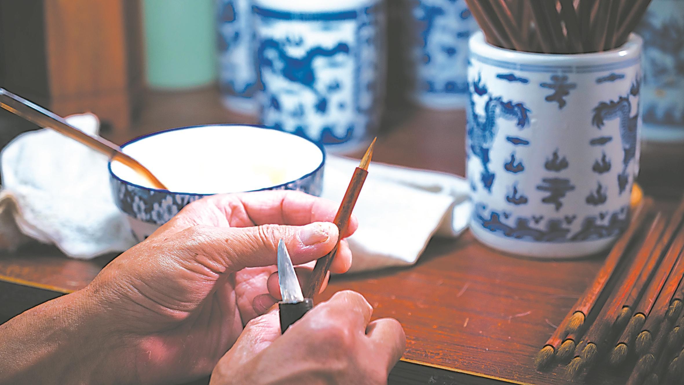 7月23日,國家級非物質(zhì)文化遺產(chǎn)“宣筆制作技藝”代表性傳承人佘征軍在安徽省非遺傳習(xí)基地展示宣筆制作技藝。