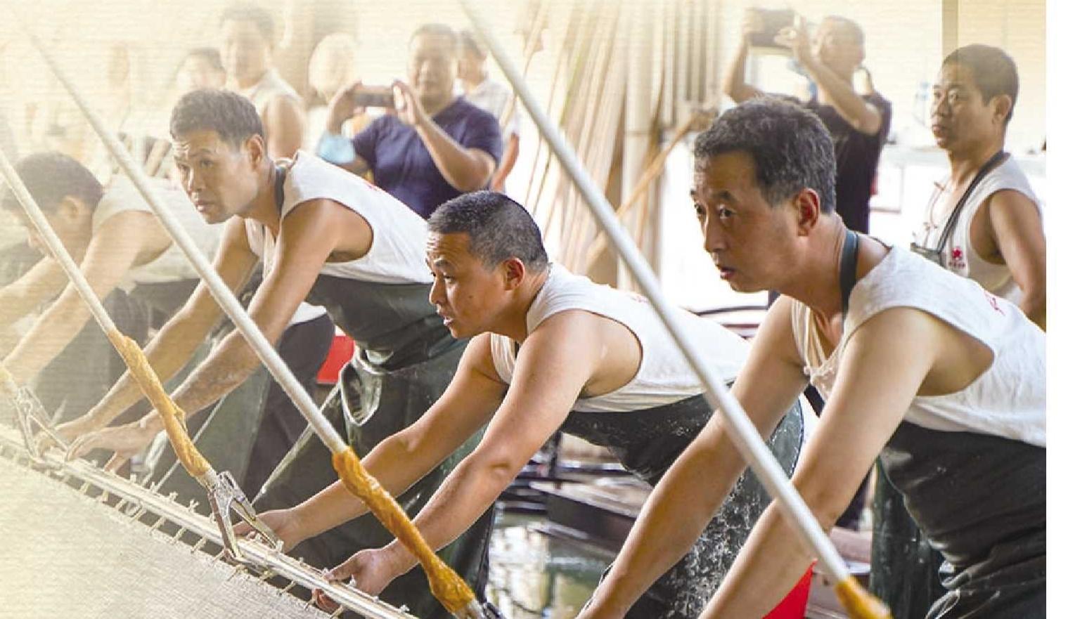 7月23日,大國工匠、全國五一勞動獎?wù)芦@得者毛勝利和省級非物質(zhì)文化遺產(chǎn)項目宣紙代表性傳承人汪息發(fā)在現(xiàn)場向游客展示宣紙制作這一承載了徽香墨韻的千年古技。