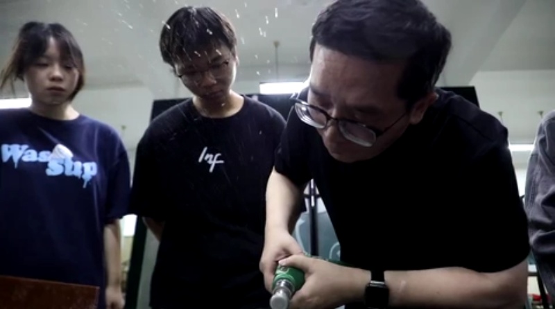 近日,在臺(tái)州職業(yè)技術(shù)學(xué)院藝術(shù)學(xué)院,浙江省工藝美術(shù)大師金樹立正為學(xué)生們演示玻璃雕刻技藝。