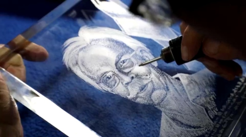除了探索“接地氣”的產(chǎn)業(yè)模式,吳氏玻雕在技藝上不斷創(chuàng)新、開拓。傳統(tǒng)的臺(tái)州玻雕以花鳥、山水為主要雕刻內(nèi)容,吳氏玻雕第二代傳人吳剛則突破傳統(tǒng),將肖像作為玻雕的一項(xiàng)重要主題,創(chuàng)作了大量國內(nèi)外名人肖像玻雕作品。
