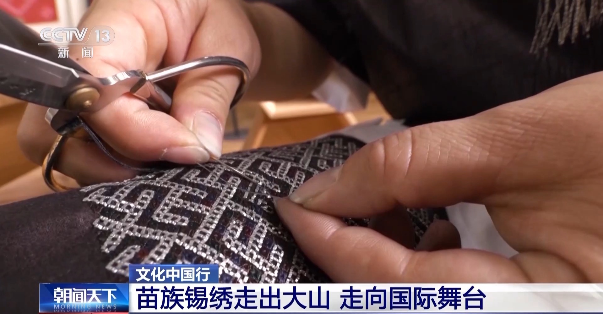 苗族錫繡非遺傳承人 王亨石:按照他要尺寸的大小自己繡出來(lái),繡出來(lái)以后寄給他,他自己再設(shè)計(jì)出作品,參展,走向國(guó)際時(shí)裝周。我想生在大山里面幾百年的錫繡,今天能走上這么高的國(guó)際舞臺(tái),我真的感到很高興而且很自豪。