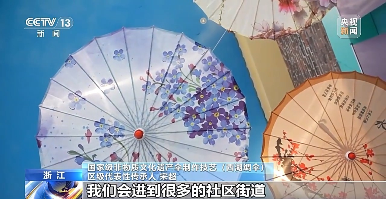 國家級非物質(zhì)文化遺產(chǎn)傘制作技藝(西湖綢傘)區(qū)級代表性傳承人 宋超:我們會進到很多的社區(qū)街道,我們會進到中小學的校園、博物館、非遺展示館等等這樣的地方,去進行我們西湖綢傘技藝的展示展覽,包括各種各樣的體驗活動,以此讓更多人了解和認識到我們西湖綢傘這項技藝。