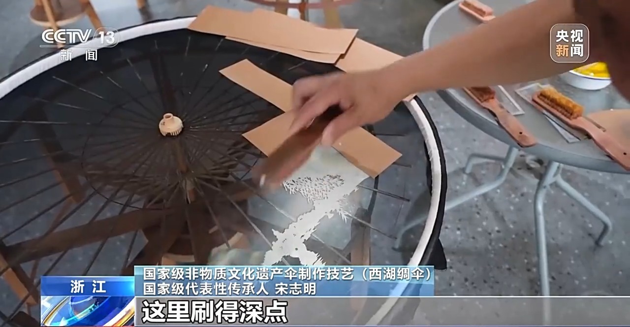 國家級非物質(zhì)文化遺產(chǎn)傘制作技藝(西湖綢傘)國家級代表性傳承人 宋志明:刷的過程當中有講究,手勢的輕重,融合什么顏色,比方說這里是個亮點,這里刷得深點,這里讓顏料自然地飄過去,這里就不刷了,點到為止了。像這里有個月亮,它的光是從這里射下來的,所以我這里就讓顏料自然地飄過去,樹蔭這里要加強,這里要刷深。