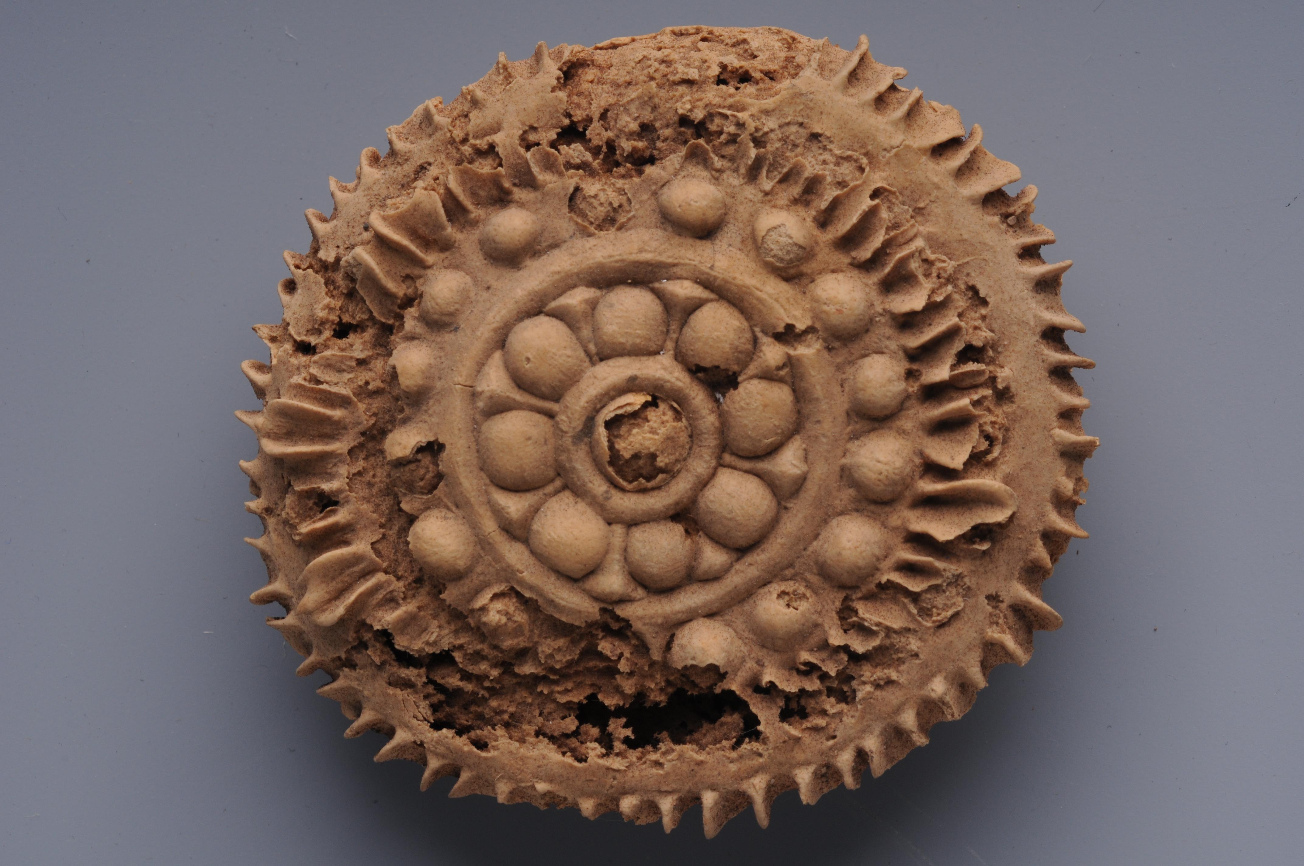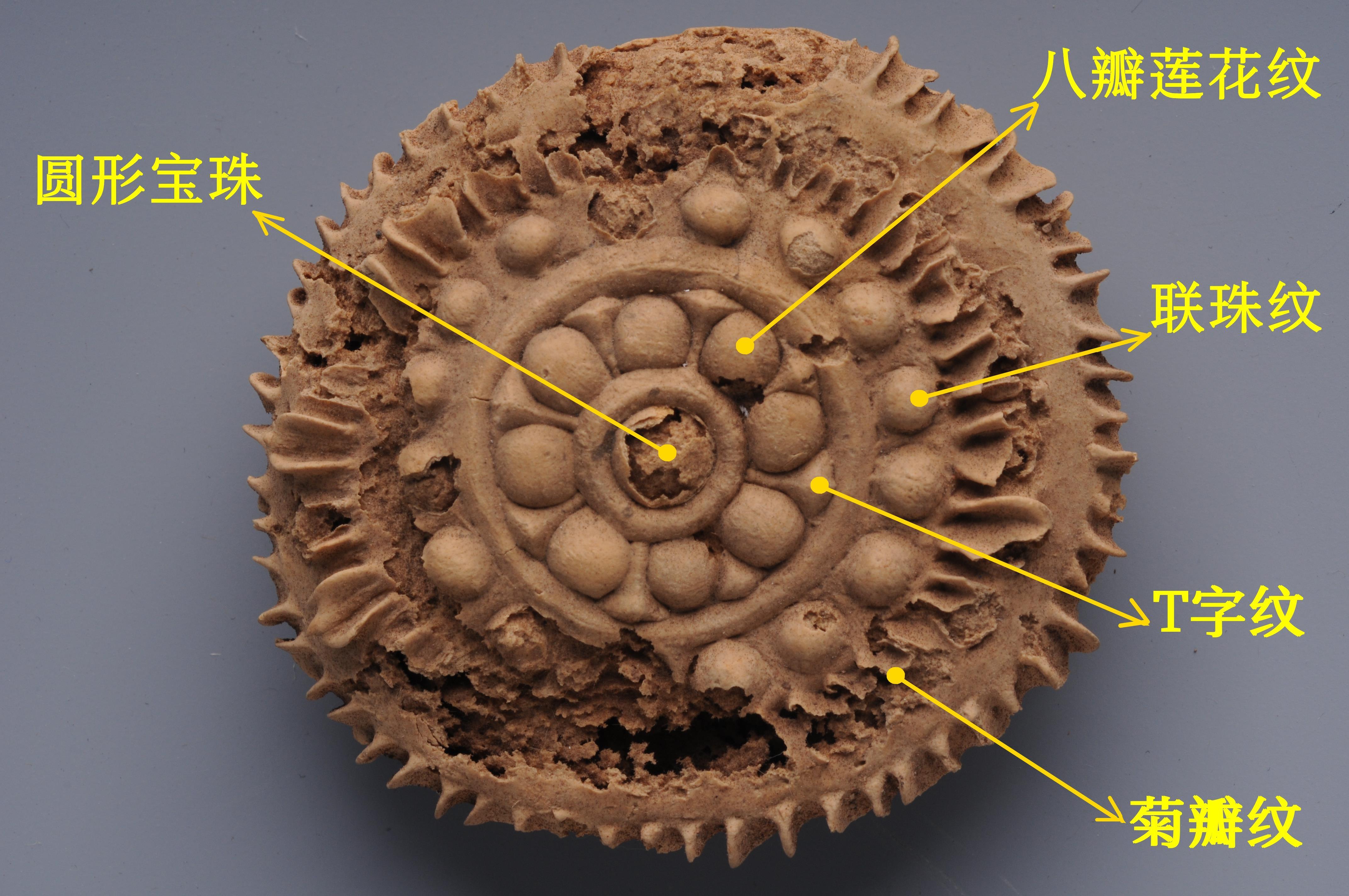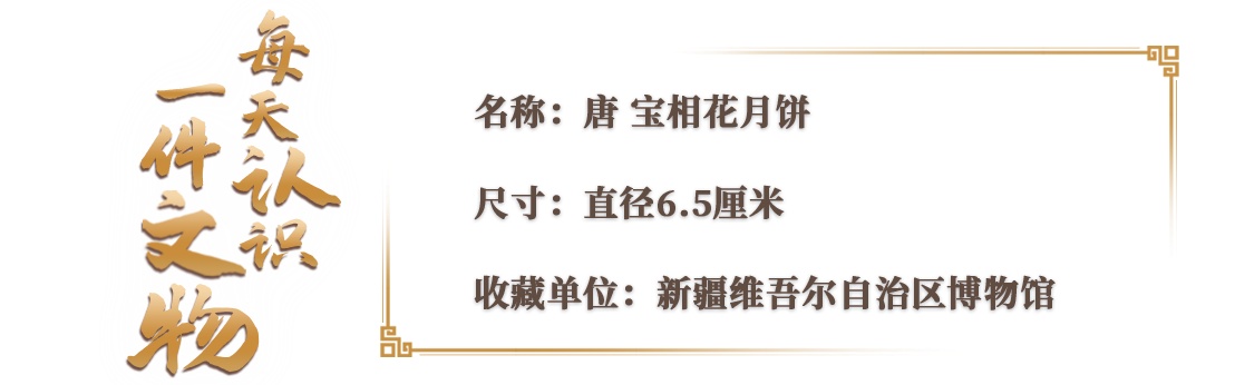 這塊寶相花月餅 出土于新疆吐魯番 是目前僅有的一件 唐代月餅式食物文物 外觀以八瓣蓮花紋為中心 每個蓮瓣間是T字紋 中間包裹住一個圓形寶珠 外圍飾有一圈聯(lián)珠紋 再往外,飾菊瓣紋