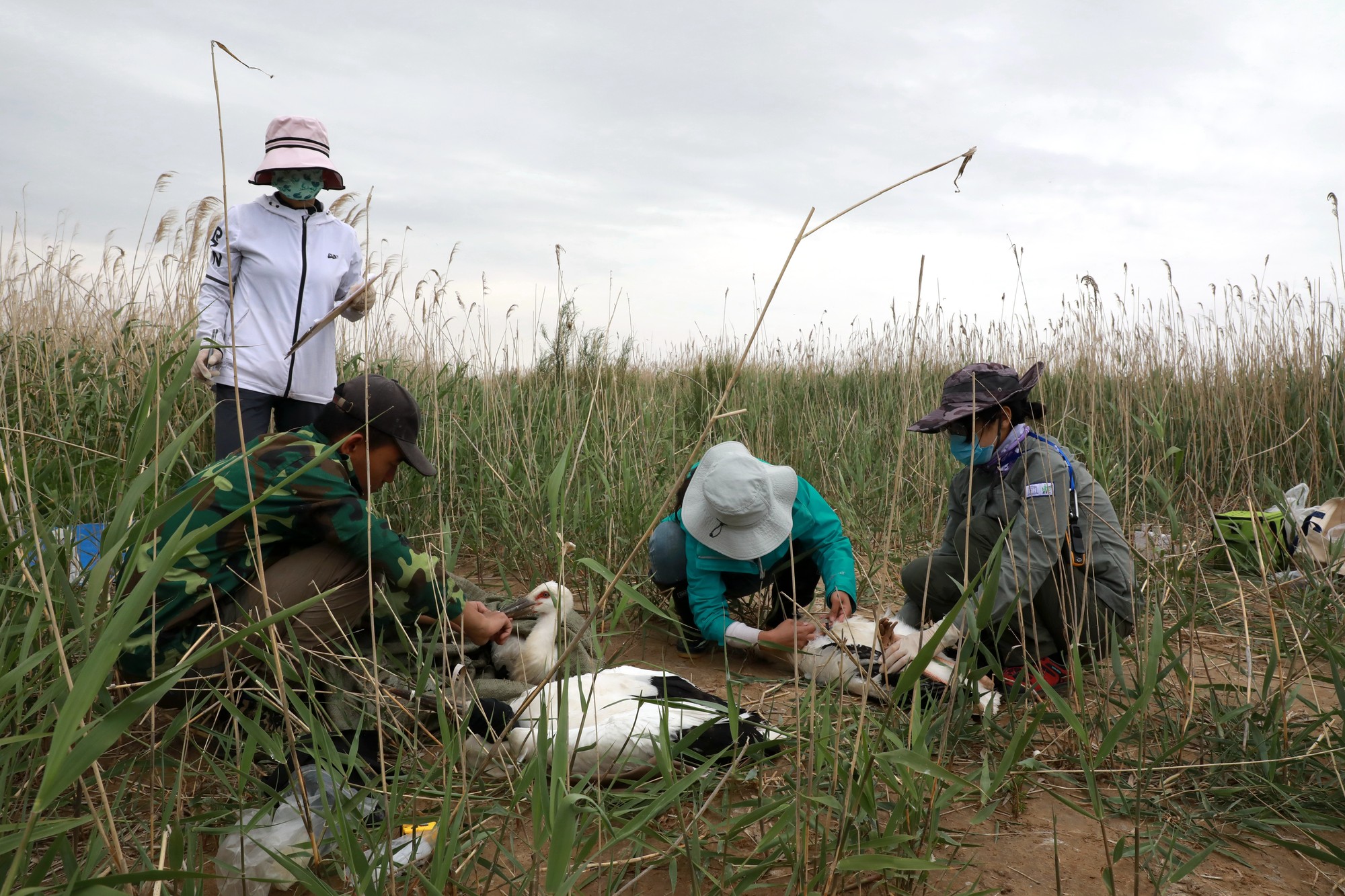 淡水河流濕地 充裕的淡水使鹽堿水不再向上滲出,植物生存環(huán)境持續(xù)改善。緊接著,2021年以來(lái)保護(hù)區(qū)陸續(xù)實(shí)施了17個(gè)濕地修復(fù)與生物多樣性保護(hù)項(xiàng)目,恢復(fù)鹽地堿蓬、海草床等本土植物5.2萬(wàn)畝,修復(fù)濕地超過30萬(wàn)畝。 光板地長(zhǎng)出了鹽地堿蓬,長(zhǎng)出了蘆葦,長(zhǎng)出檉柳?!吧鷳B(tài)環(huán)境好不好,鳥兒最知道”。越來(lái)越多的鳥兒“用翅膀投票”,在這里越冬、建巢、繁衍。目前,保護(hù)區(qū)的鳥類數(shù)量已經(jīng)從設(shè)立初期的187種增加到373種。 留得住,更要護(hù)得好 乘坐電瓶車穿梭在蘆葦蕩中,不時(shí)有白鷺、鴻雁等鳥兒掠過。遠(yuǎn)處的電線桿上,幾乎每根桿子頭上都立著一只大鳥。 保護(hù)區(qū)工作人員崔寧興奮地告訴記者:“你看這個(gè)就是東方白鸛!這個(gè)電線桿上也有,離我們非常近?!?/p> 東方白鸛是我國(guó)一級(jí)重點(diǎn)保護(hù)野生動(dòng)物,也是保護(hù)區(qū)候鳥遷徙的標(biāo)志性鳥類,每年都有2000多只從俄羅斯遠(yuǎn)東和我國(guó)東北地區(qū)來(lái)到這里。大部分在此,隨后繼續(xù)往南,飛往長(zhǎng)江中下游的沼澤湖泊,剩下的就留在這里越冬。 眼下,越來(lái)越多的東方白鸛相中了保護(hù)區(qū)的環(huán)境,扎根在此,成為留鳥。