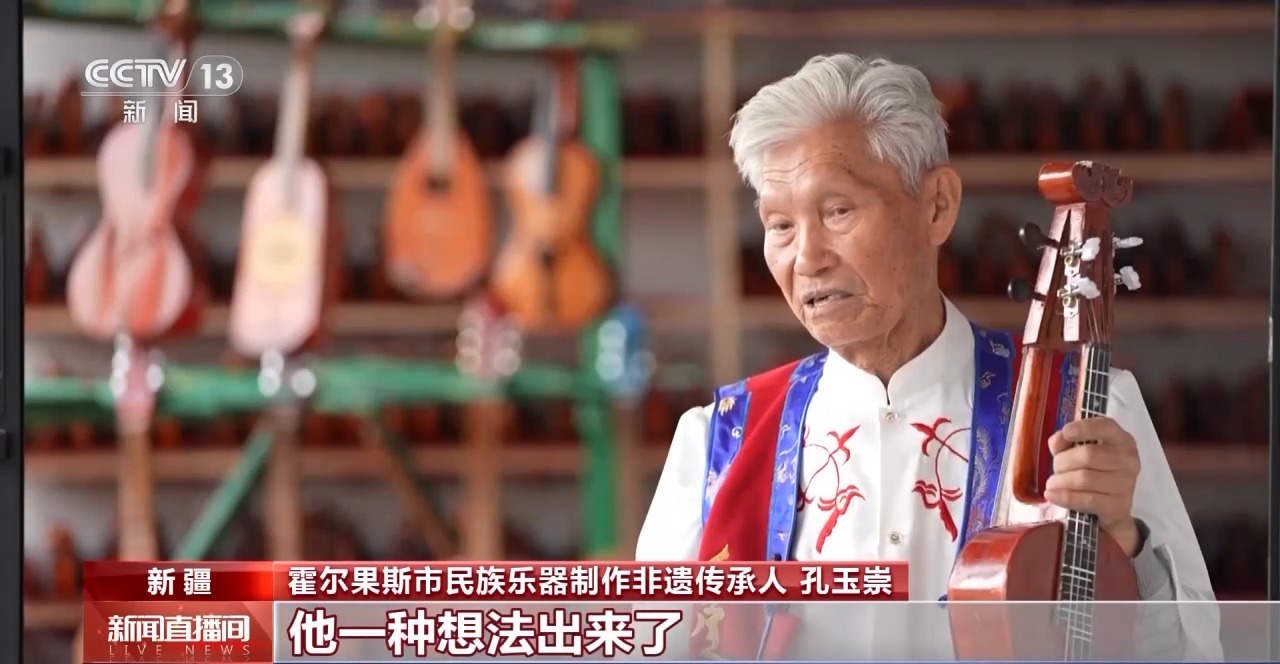 霍爾果斯市民族樂器制作非遺傳承人 孔玉崇:鴛鴦是很美好的,它有兩個(gè)腹板,也可以互為背板。它的頭是兩個(gè)鴛鴦,在一個(gè)腿上可以彈,坐著也可以拉,很方便。你帶著這么一把琴就等于帶了兩把琴,因?yàn)樗囊灿校瑥椀囊灿小?/p> 今年83歲的孔玉崇,退休前是霍爾果斯伊車嘎善鄉(xiāng)小學(xué)的一名教師,從小就癡迷于各種樂器的演奏和制作。老人說,在他懵懂的少年時(shí)代,就一直聽到當(dāng)?shù)赜幸粋€(gè)關(guān)于鴛鴦琴的傳說。