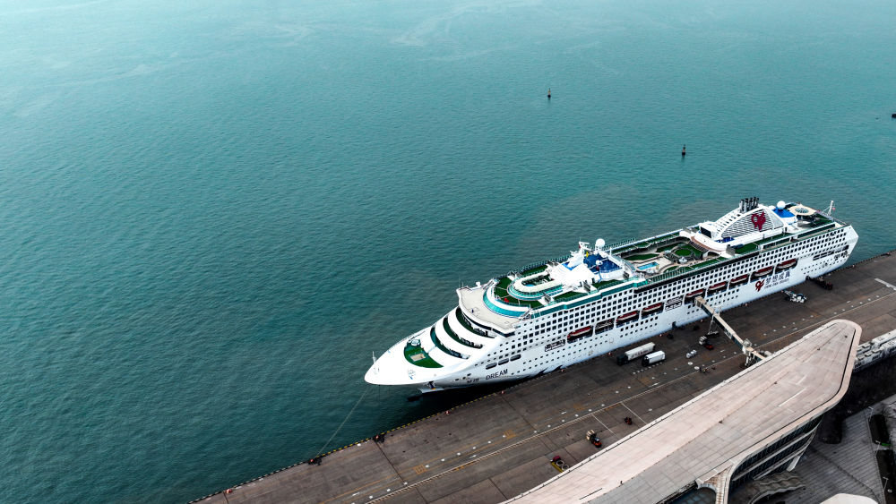 ↑一艘國際郵輪??吭谔旖驀H郵輪母港(無人機(jī)照片,12月19日攝)。