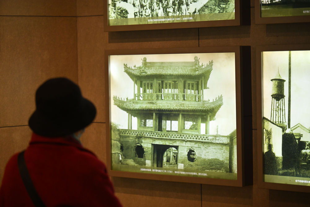↑一名曾居住在天津老城廂的市民在天津鼓樓博物館參觀(12月17日攝)。