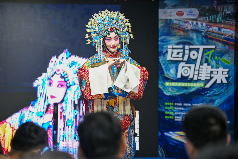 ↑戲曲表演者在海河游船上為游客演出(3月28日攝)。
