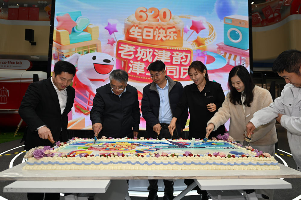 ↑市民及專家學(xué)者在位于天津南開區(qū)的一家商場內(nèi)為城市慶生切蛋糕(12月22日攝)。