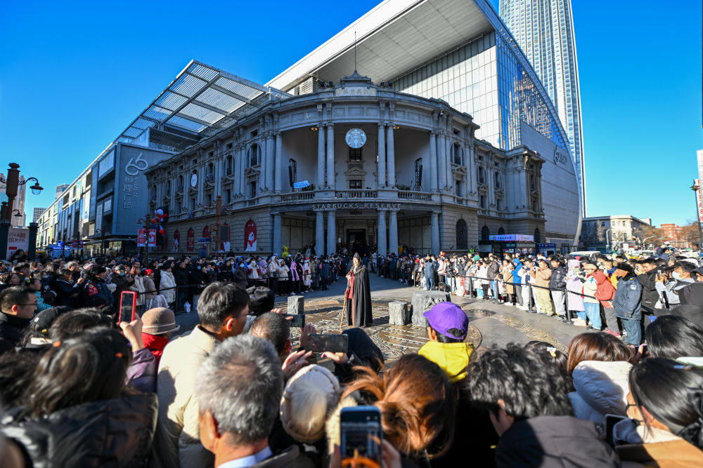 ↑市民游客在天津金街大銅錢廣場觀看天津人民藝術(shù)劇院帶來的沉浸式戲劇演出(12月21日攝)。