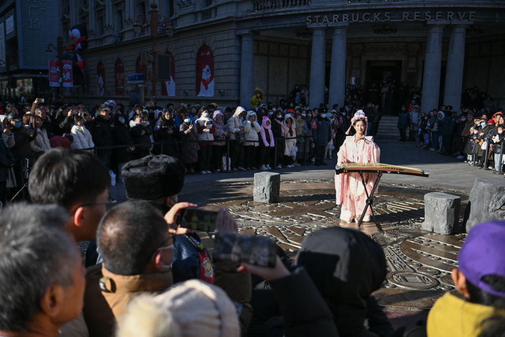 ↑古箏表演者在天津金街步行街大銅錢廣場演出(12月21日攝)。