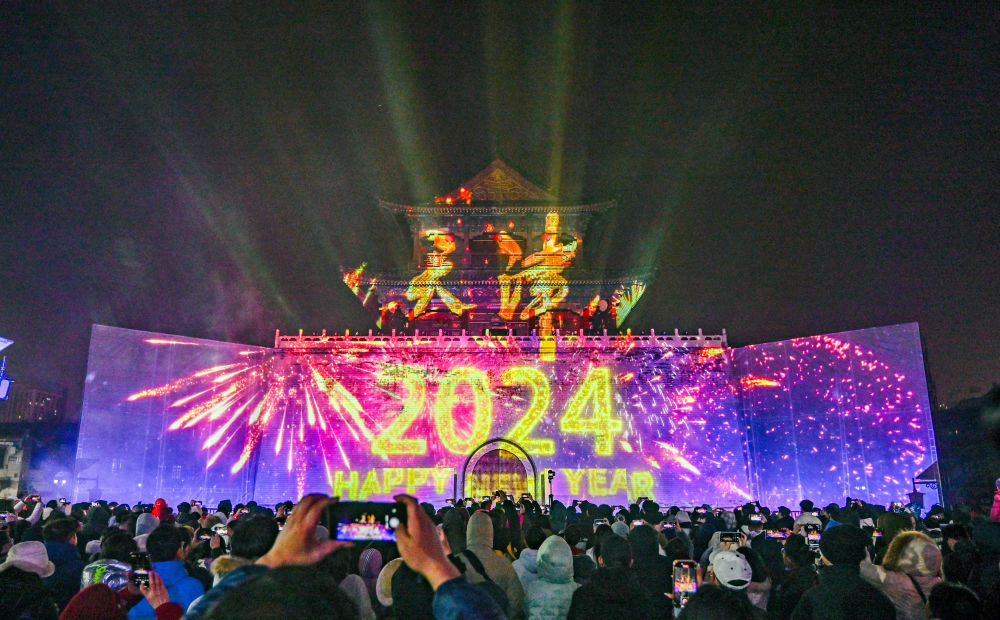↑市民游客在天津鼓樓觀看跨年燈光秀(1月1日攝)。