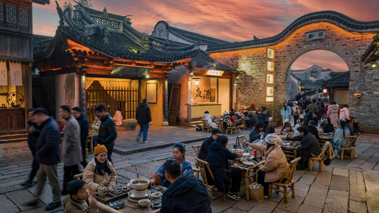 在浙江嘉興烏鎮(zhèn)景區(qū),游客們圍坐一桌,吃暖鍋,在暖意融融中體驗(yàn)水鄉(xiāng)古鎮(zhèn)的文化韻味。據(jù)介紹,為邀各方游客享美食、佳釀,烏鎮(zhèn)景區(qū)特別推出以特色湖羊?yàn)橹鳌芭仭焙湍曦浭屑?、冬夜?shī)會(huì)等文化活動(dòng)。