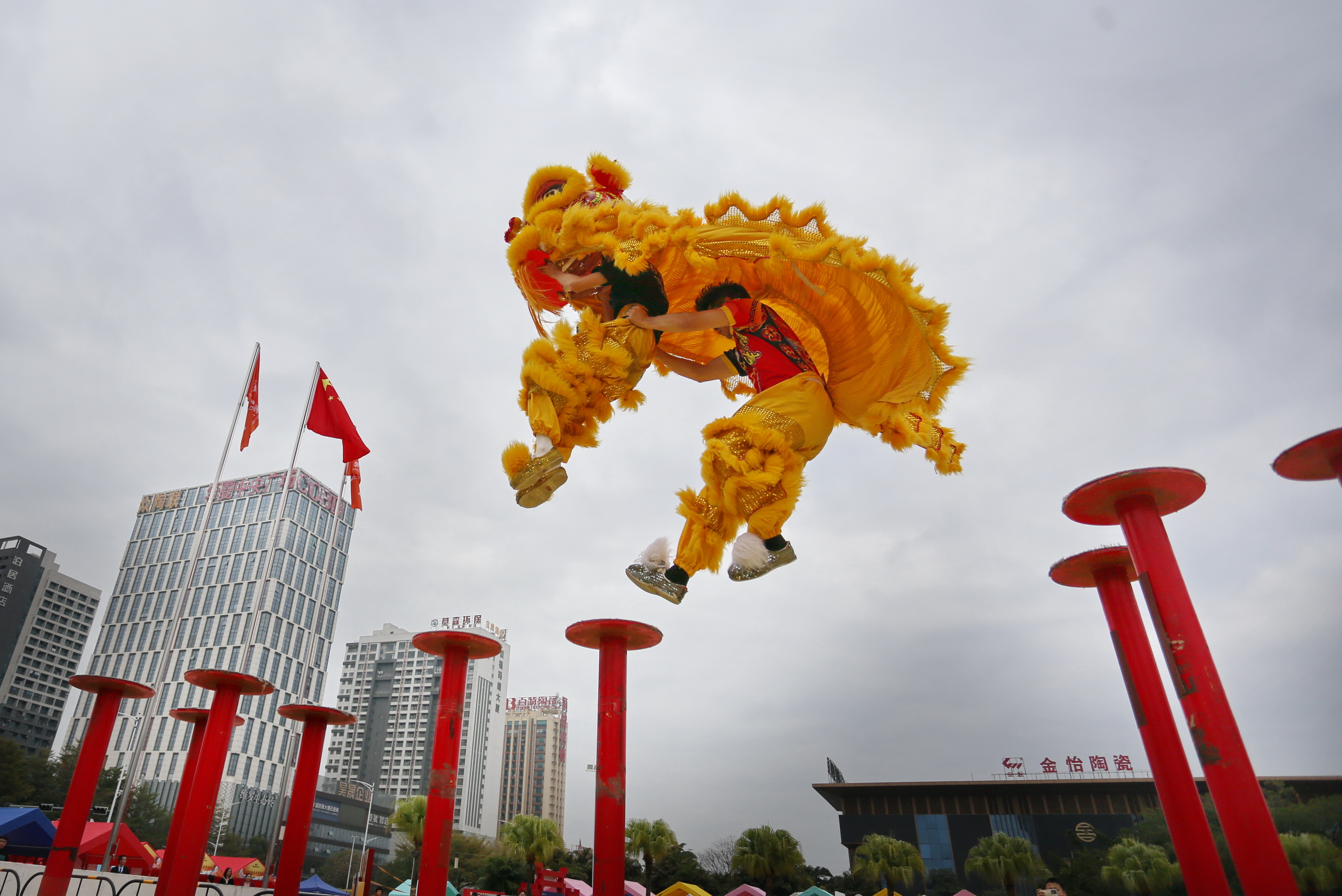 1月24日,在廣東省鶴山市鶴城鎮(zhèn),醒獅隊(duì)隊(duì)員進(jìn)行梅花樁舞獅訓(xùn)練。