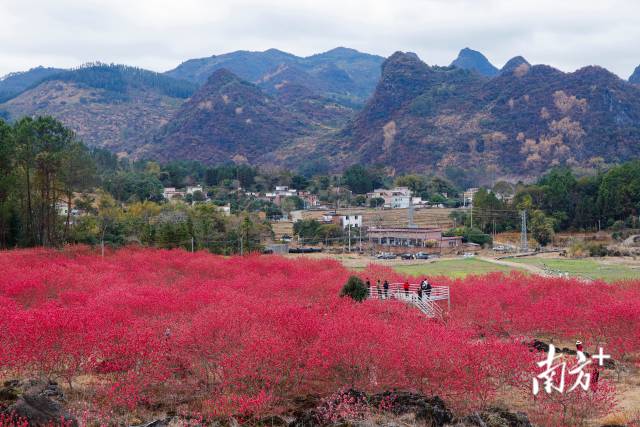 潮州鳳凰山山頂?shù)亩霹N花競相開放,與茶山云海共繪春日盛景。