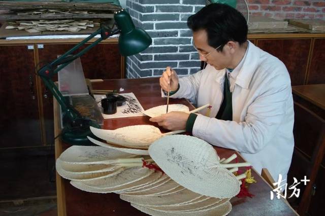 廣東省工藝美術(shù)大師、新會葵藝的國家級代表性傳承人正在制作葵藝扇。