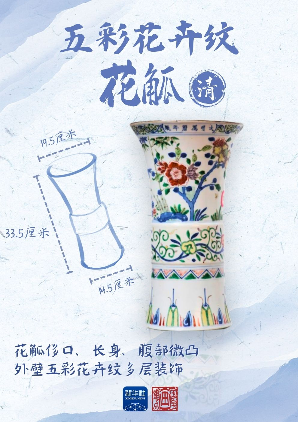 這件清代的五彩花卉紋花觚 外壁用五彩花卉紋多層裝飾 花枝伸展,鮮艷欲滴 體現(xiàn)出五彩斑斕的春色