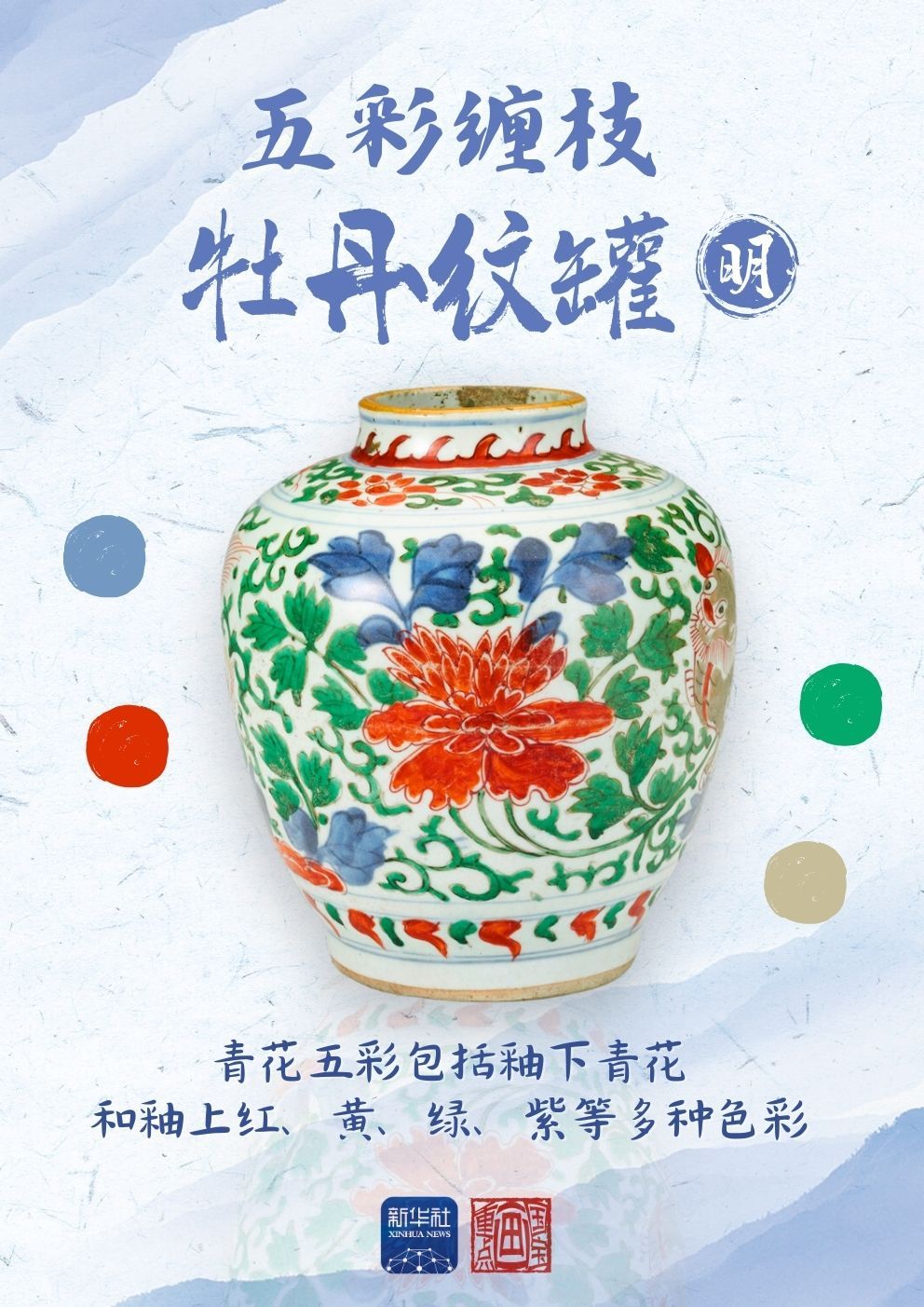 “谷雨三朝看牡丹” 牡丹花開的重要時(shí)段就是谷雨前后 牡丹花 被稱為谷雨花、富貴花 谷雨時(shí)節(jié)賞牡丹已綿延千年 牡丹花元素在我國(guó)古人社會(huì)生活中使用頻繁 五彩瓷器約在明宣德年間出現(xiàn) 于嘉靖、萬(wàn)歷時(shí)期盛極一時(shí) 這件青花五彩瓷器色彩繽紛、紋飾生動(dòng) 罐身鮮艷的色彩對(duì)比盡顯牡丹花的雍容華貴 是明清時(shí)期瓷器燒制的精品之作