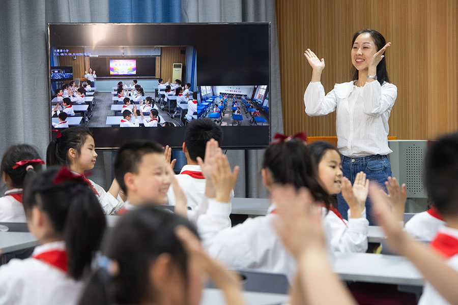 2022年5月16日,在湖北省荊州市沙市大賽巷小學(xué),學(xué)生通過“空中課堂”與偏遠(yuǎn)鄉(xiāng)鎮(zhèn)的丫角小學(xué)一起進(jìn)行韻律操活動。 新華社記者 肖藝九 攝