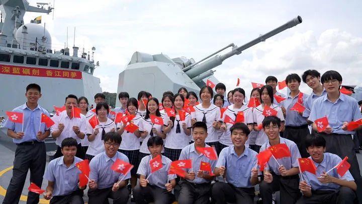 △2025年7月3日,中國海軍山東艦航母編隊抵達香港。香港中學生登上海軍運城艦參觀、留影。