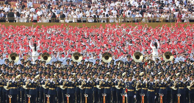 紀(jì)念大會(huì)開始前,天安門廣場上,千人聯(lián)合軍樂團(tuán)演奏四首歌曲,合唱團(tuán)唱響《松花江上》《在太行山上》《保衛(wèi)黃河》《沒有共產(chǎn)黨就沒有新中國》。