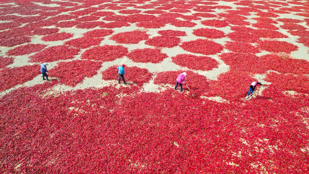 ↑2025年9月20日,農(nóng)民在甘肅省酒泉市肅州區(qū)三墩鎮(zhèn)晾曬紅辣椒。(無人機(jī)照片)CICPHOTO/曹紅祖 攝