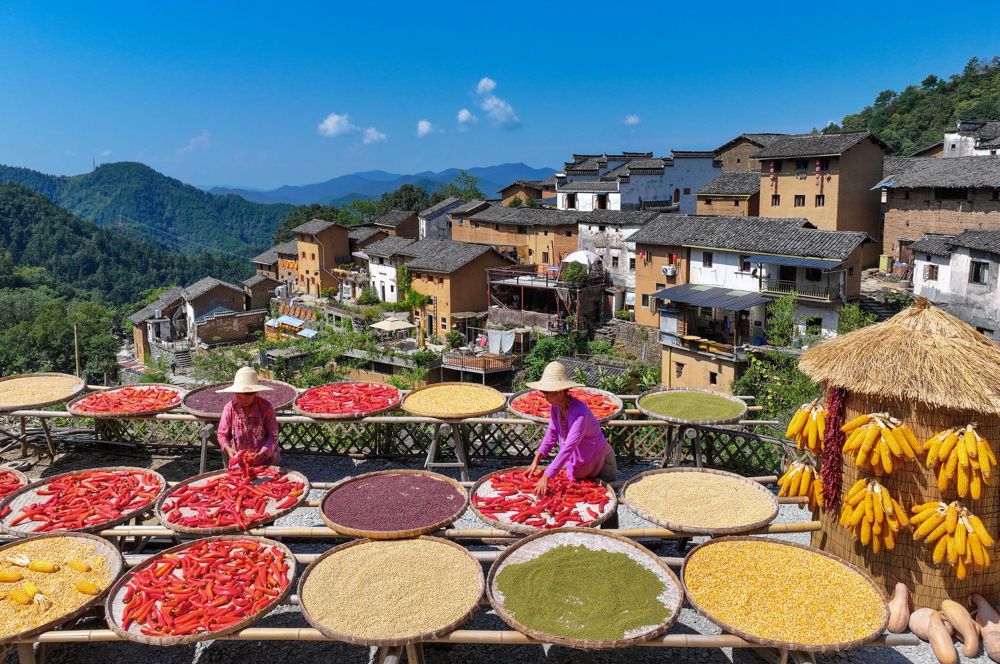 ↑2025年9月17日,農(nóng)民在安徽省黃山市歙縣深渡鎮(zhèn)陽產(chǎn)村晾曬稻谷、玉米、南瓜、紅辣椒等農(nóng)作物。CICPHOTO/施亞磊 攝