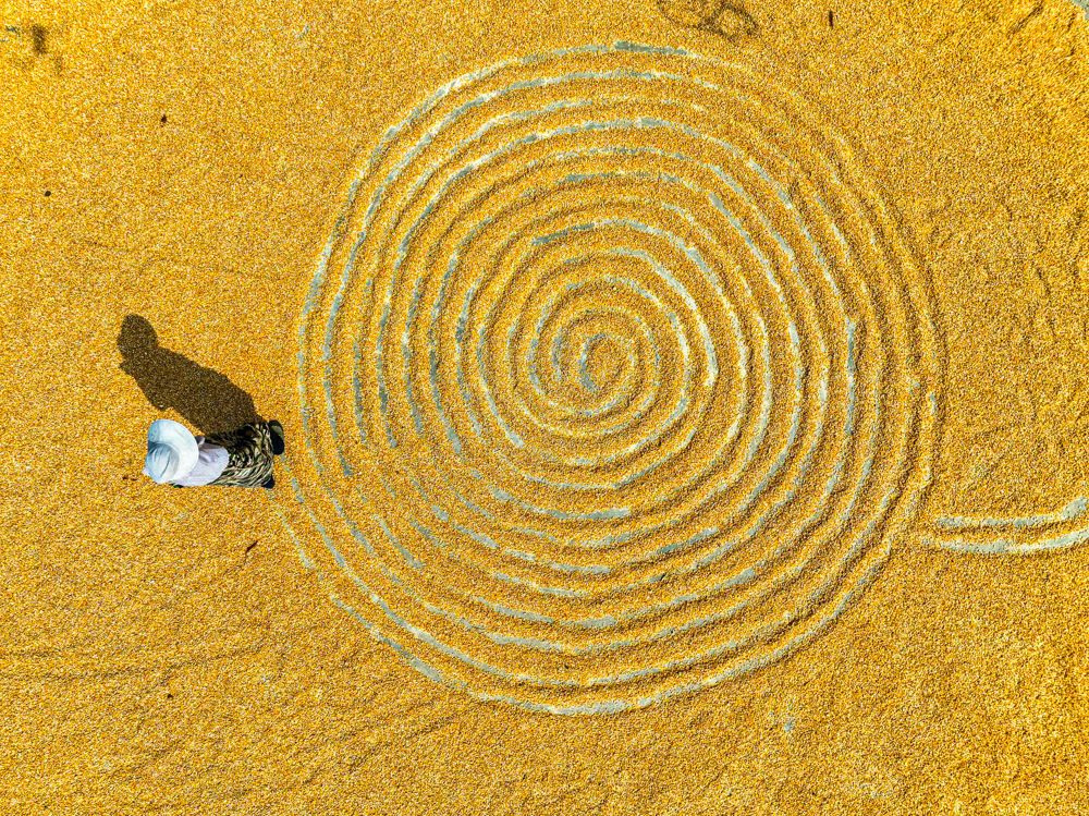↑2025年9月13日,農(nóng)民在貴州省黔東南苗族侗族自治州從江縣東朗鎮(zhèn)擺啊村翻曬稻谷。(無人機(jī)照片)CICPHOTO/樊紹光 攝
