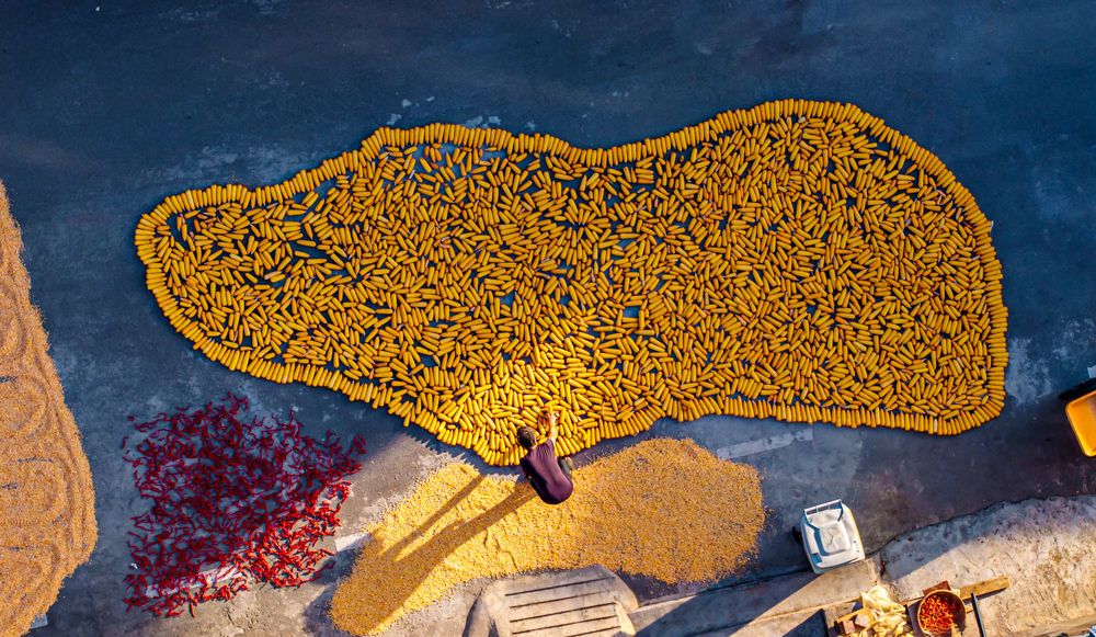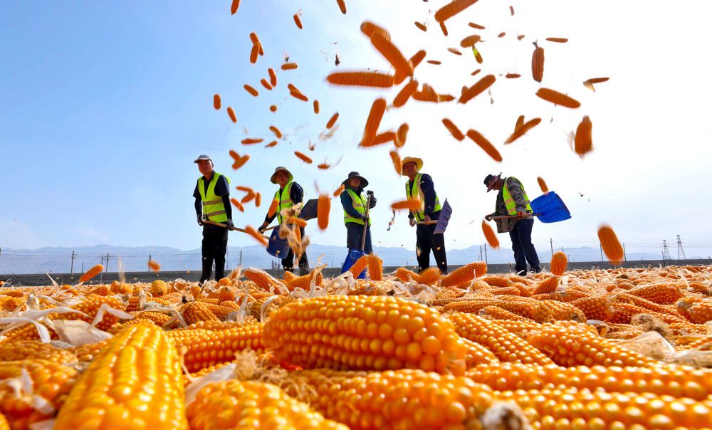 ↑2025年9月11日,工人在甘肅省張掖市高臺縣南華工業(yè)園區(qū)翻曬制種玉米。(無人機(jī)照片)CICPHOTO/王將 攝