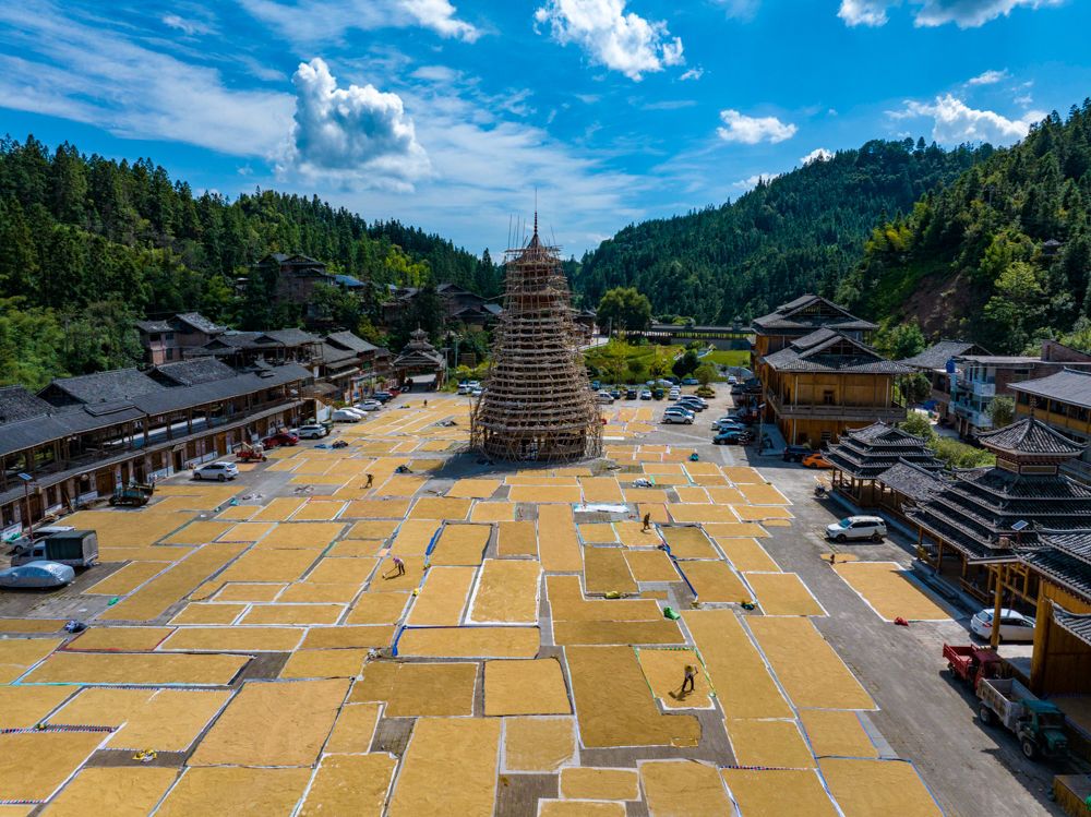 ↑2025年9月15日,農(nóng)民在貴州省從江縣高增鄉(xiāng)小黃侗寨晾曬稻谷。(無人機(jī)照片)CICPHOTO/吳德軍 攝
