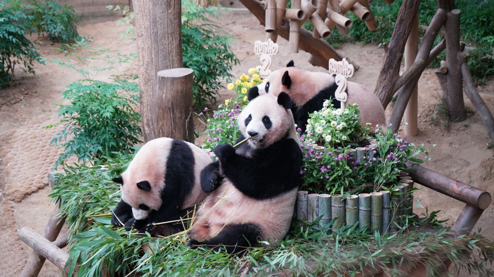 2025年7月7日,在韓國(guó)京畿道龍仁市愛(ài)寶樂(lè)園,大熊貓媽媽“愛(ài)寶”(中)和“睿寶”、“輝寶”在慶生活動(dòng)上享用美食。新華社發(fā)(孫一然攝)