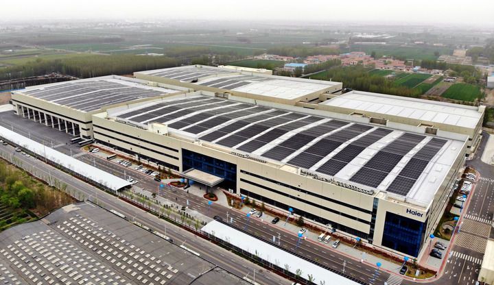 2025年4月17日拍攝的位于山東青島膠州市的海爾AI賦能多聯(lián)機(jī)互聯(lián)工廠(無人機(jī)照片)。新華社記者 李紫恒 攝